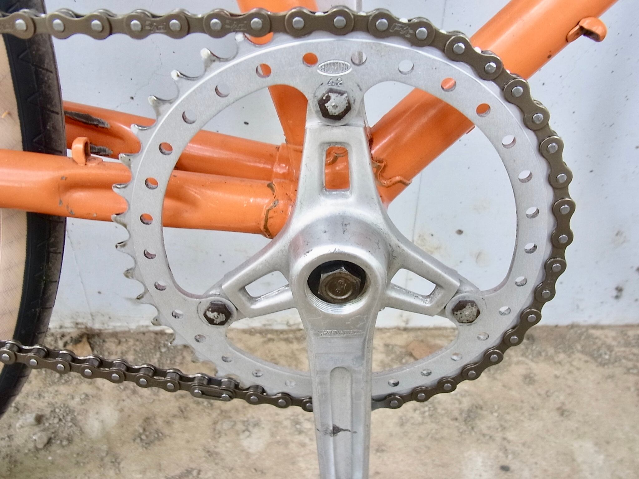 フロントチェーンリングも42Tと小さめにしておりますので坂道、街中を走り回るのにちょうど良いギア比かと思います。