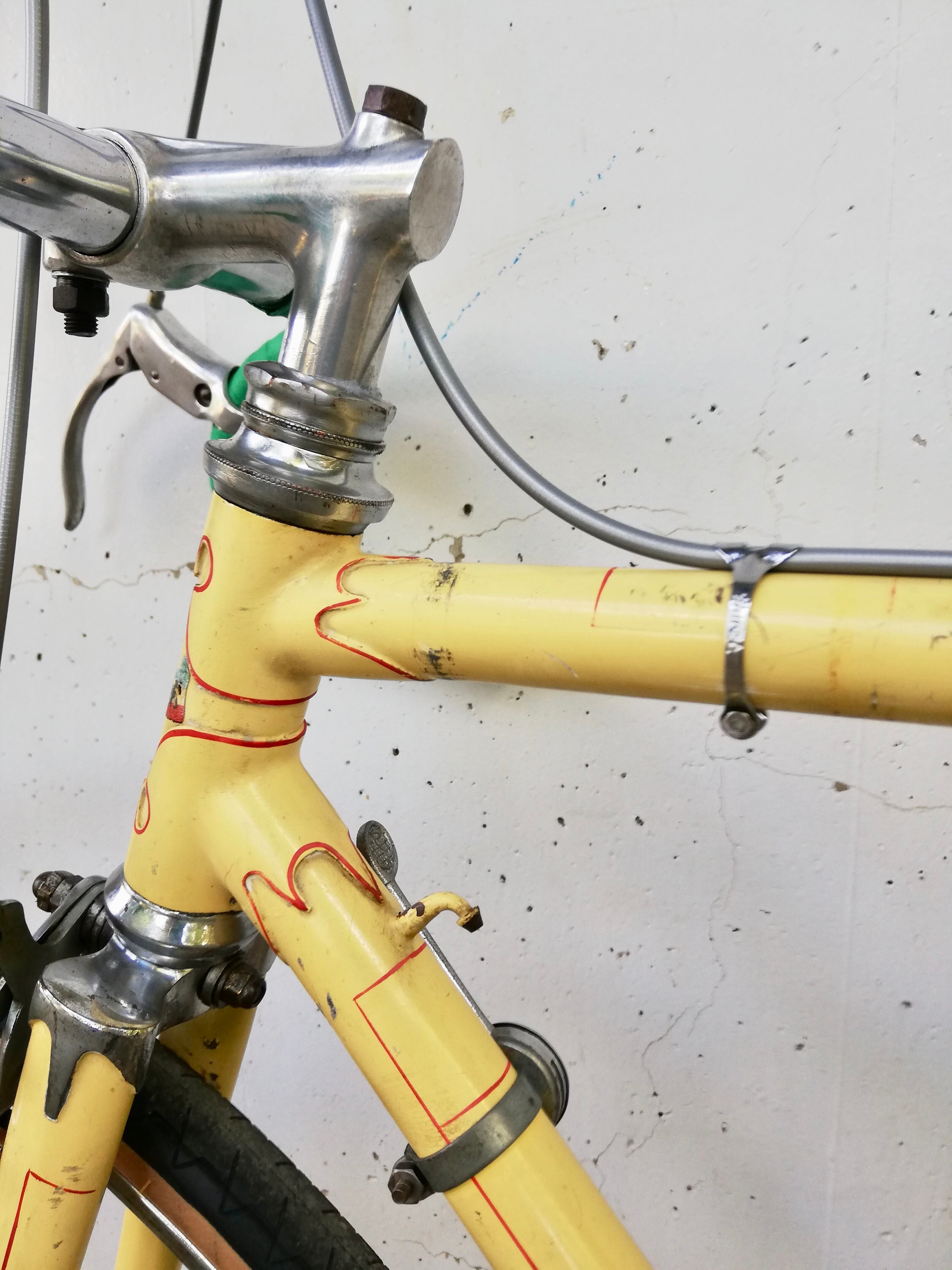 いきなりですが、メーカーは不明です。しかしながらユニークなラグの意匠、フォーク肩、溶接の質、塗装や塗装面に施した線引きなど中々凝った作りの1台ですね。