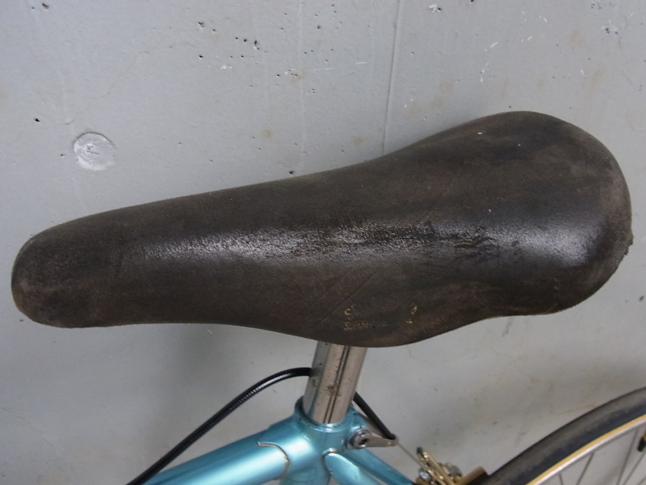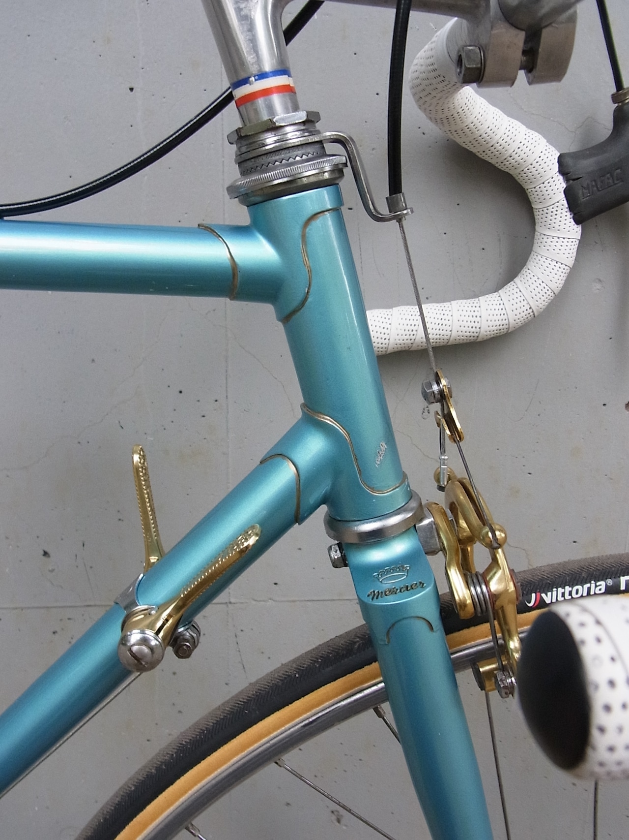 メルシエといえばピンクのフレームがアイコンですね。このフレームも元々はピンクでしたが状態があまり良くなかったため、再塗装となりました。淡めのブルーにラグ周辺にゴールドの金線引きで上品な佇まいです。
