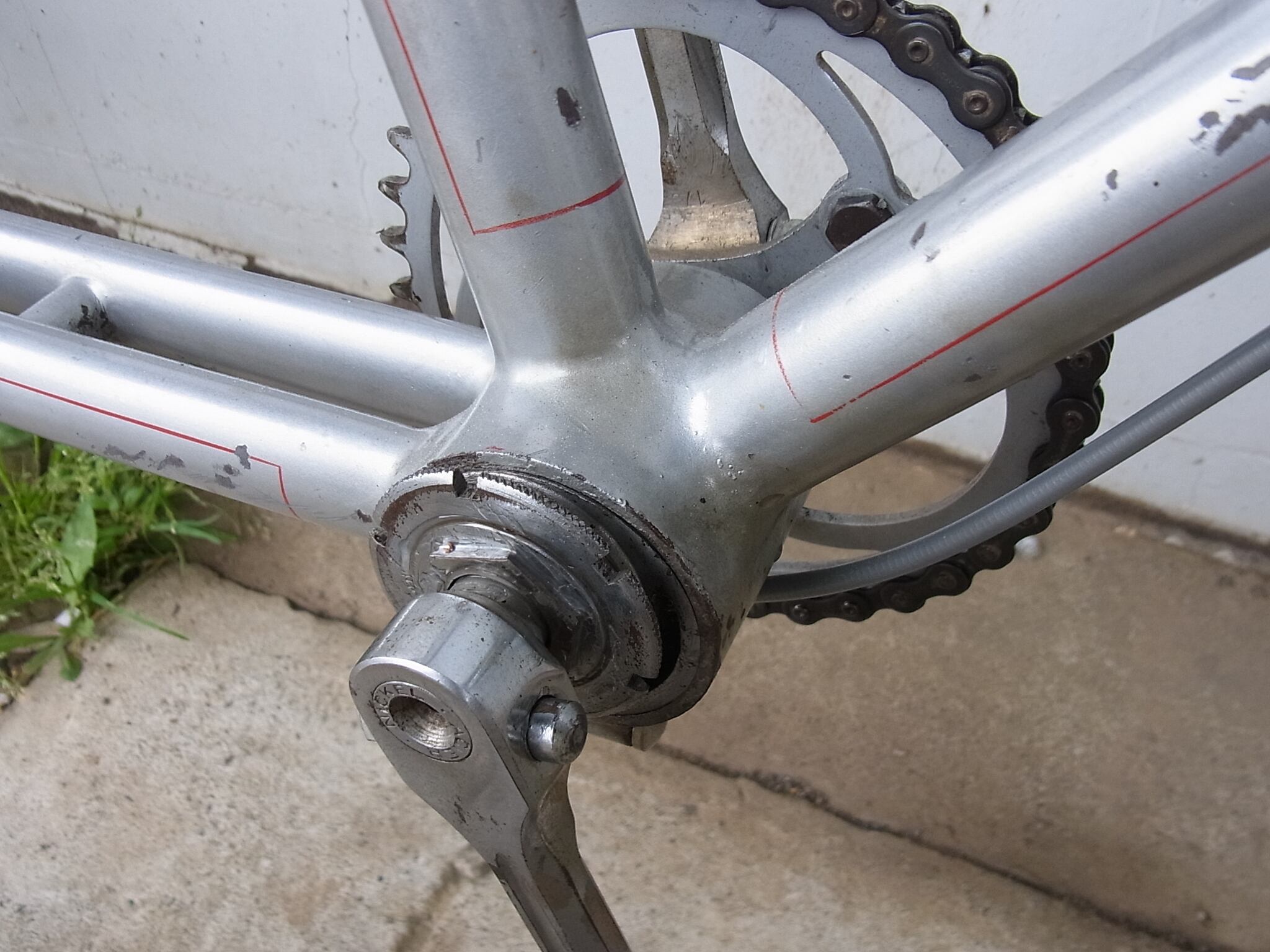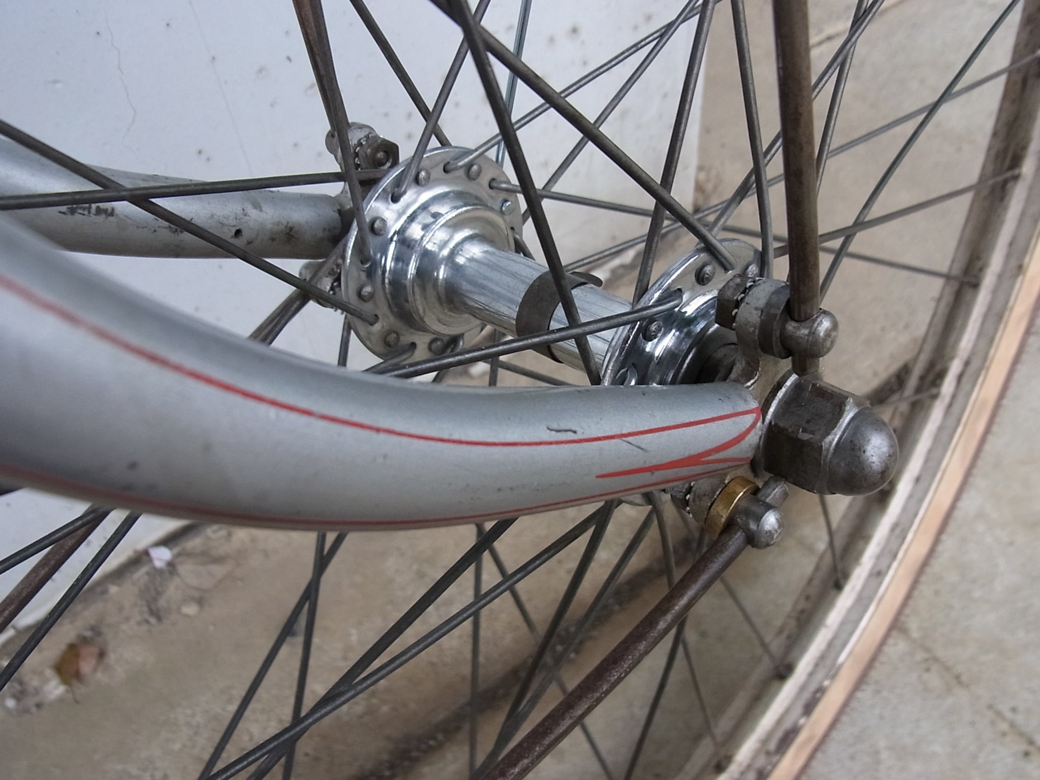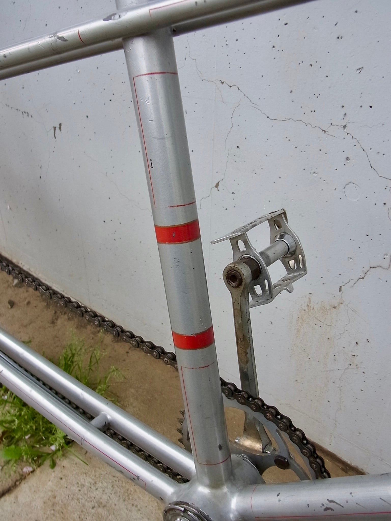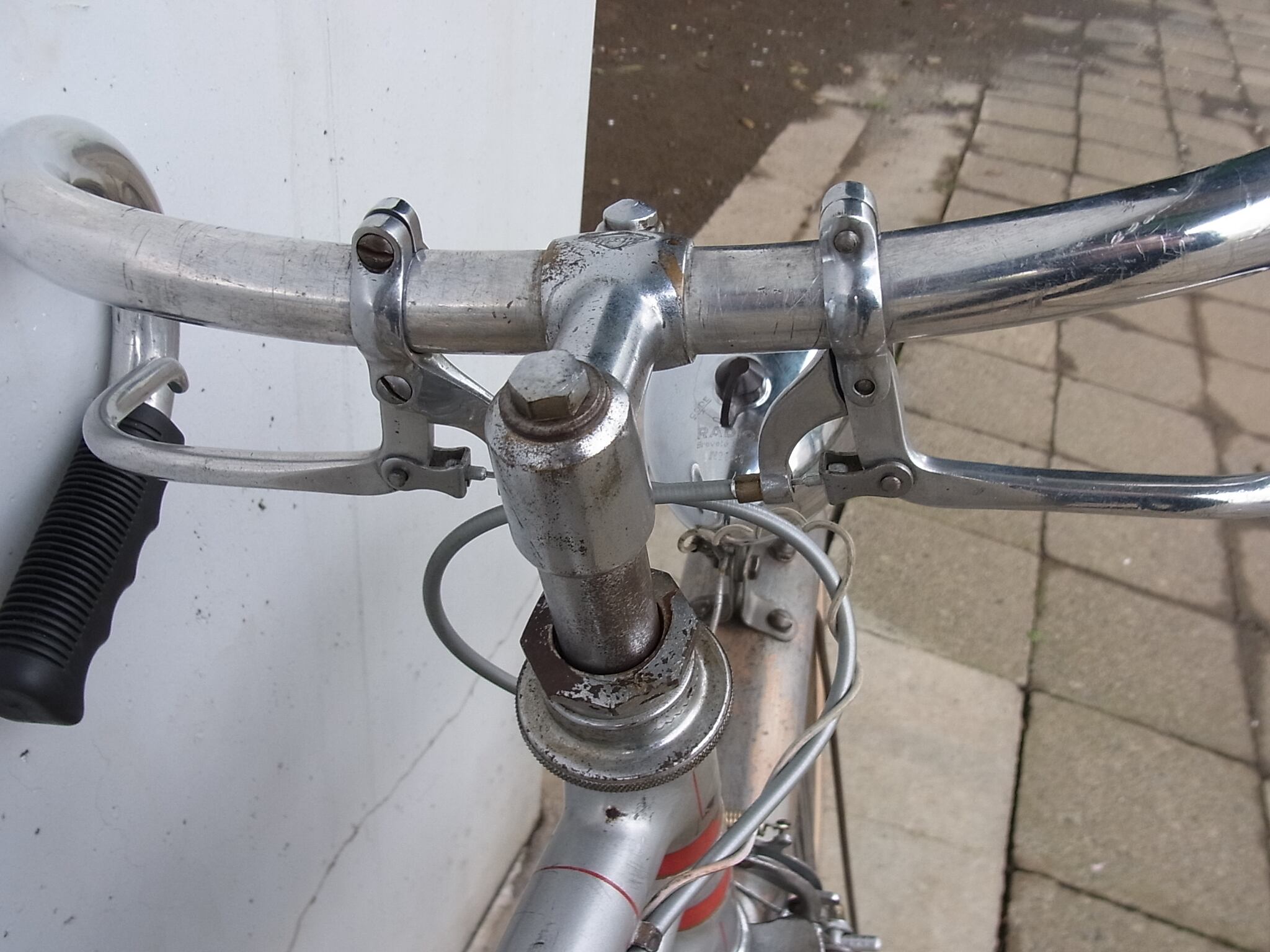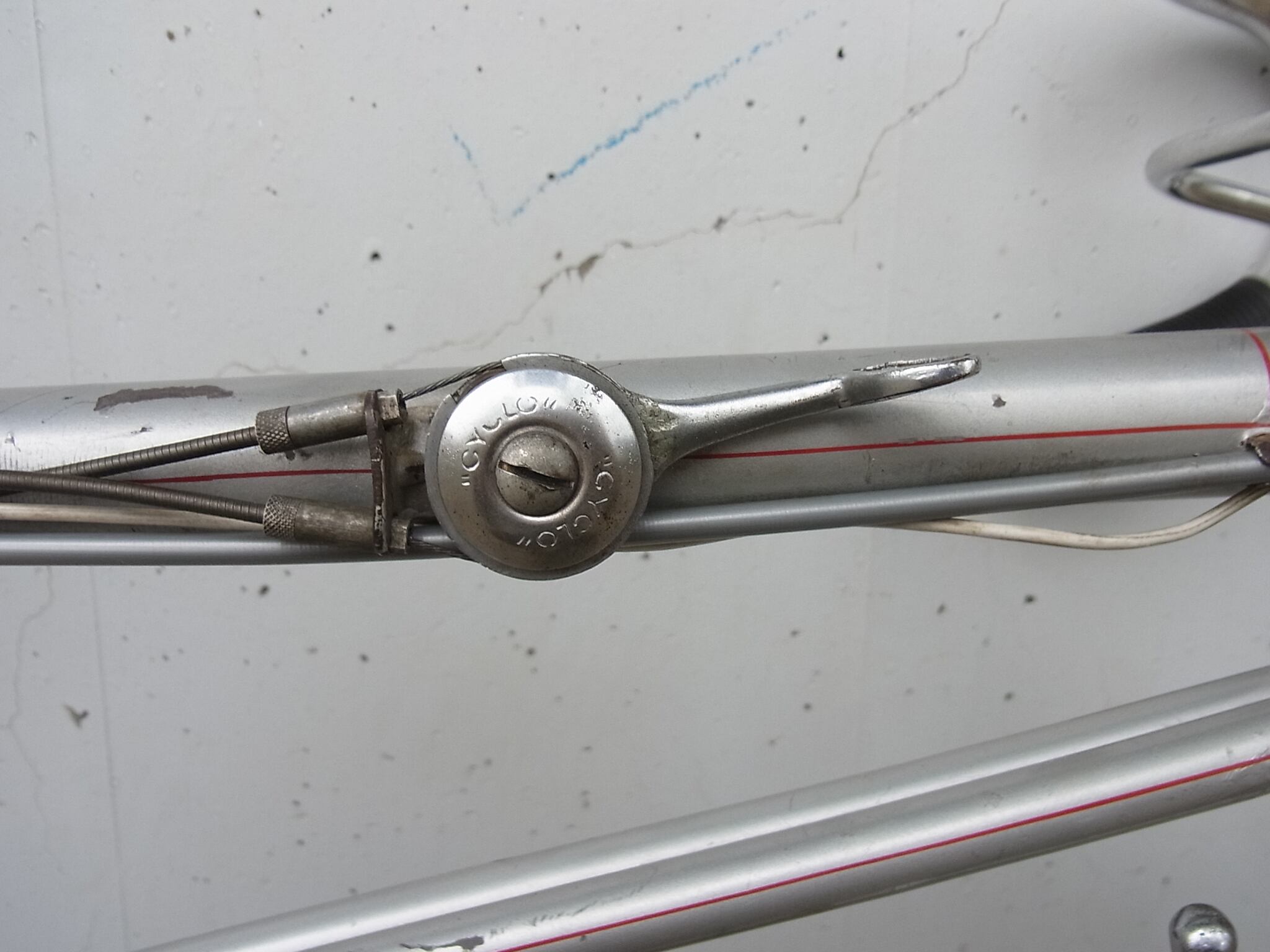当時のフレームはスチール製のパイプをラグという継手で繋ぎ溶接していましたがごちらのフレームはラグを使わずに溶接しており技術的にも難しいとされています。普通、溶接痕は多少なりともわかりますがこれは溶接後の仕上げを丁寧にしておりパイプの繋ぎの目無い一体感があります。そもそもフランスのお国柄、いい加減な仕事が多い中、この自転車は珍しく丁寧な仕事がされていますね(笑)