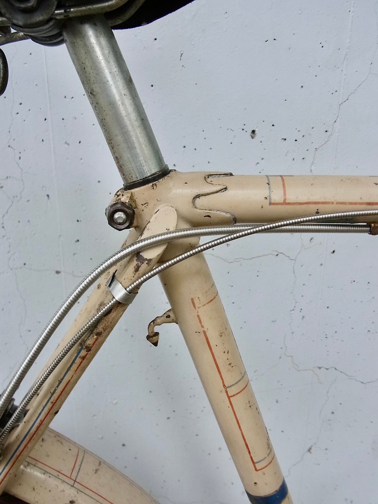 フランス国内のみならず海外にも輸出されたブランドの品質は高く、こちらの車両もパイプの継ぎ手部分はクローバーのデザインになっていたり、フロントフォーク肩はメッキ、ブランドのマークも入っており、シティーサイクル用としては凝った作りになっております。